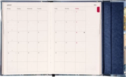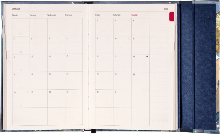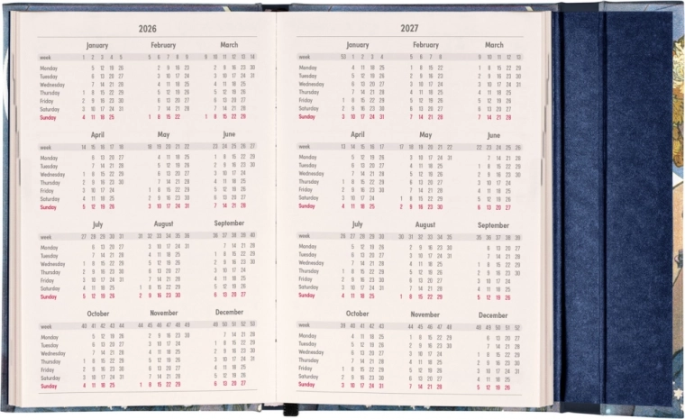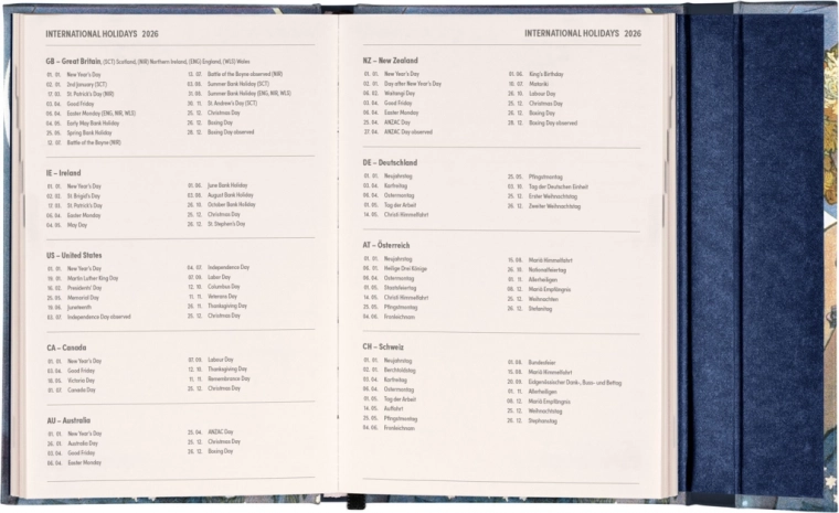 Diář zahrnuje také měsíční přehledy, které jsou ideální pro plánování prázdnin a dovolených, a obsahuje mezinárodní svátky.