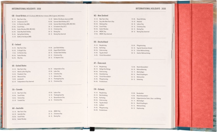 Diář je v anglickém jazyce a obsahuje také přehled mezinárodních svátků, což usnadní plánování v globálním měřítku. Díky praktickému magnetickému uzavírání se nemusíte obávat ztráty důležitých poznámek či skrytí důležitých informací.