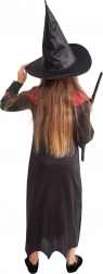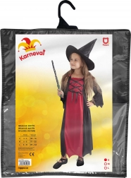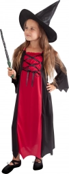 Kostým zahrnuje černé a červené šaty s dlouhým střihem a detailním šněrováním, které vytvářejí autentický čarodějnický styl. Perfektní pro Halloween či karnevalové oslavy.