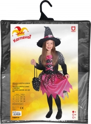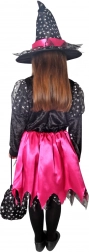 Magický kostým pro malé čarodějnice! Tento černo-růžový kostým je ideální pro holčičky od 4 do 6 let věku, zdobený růžovými stuhami a stříbrnými hvězdičkami.