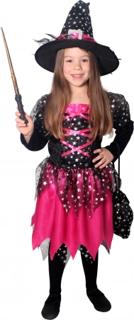 Magický karnevalový kostým pro malé čarodějnice! Černo-růžový kostým je ideální pro dívky ve věku 6-8 let, výška 117-128 cm. Vyznačuje se růžovými stuhami a stříbrnými hvězdičkami.