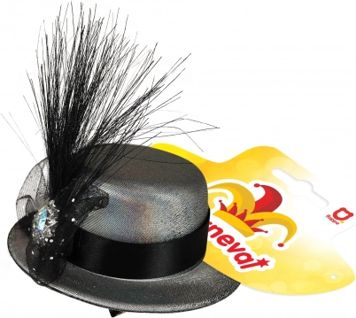 - je ozdoben černou stuhou, peřím a tylem pro sofistikovaný vzhled