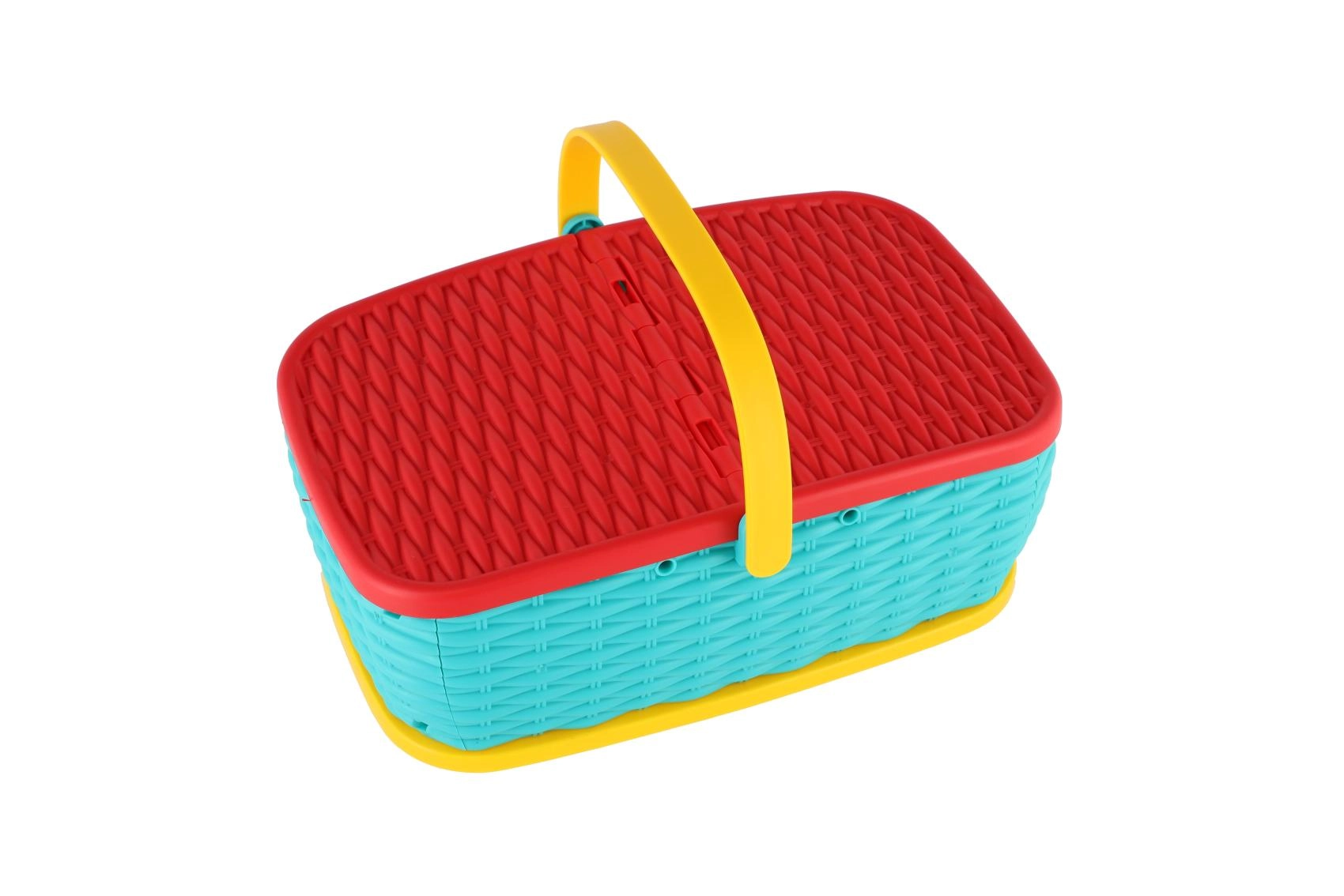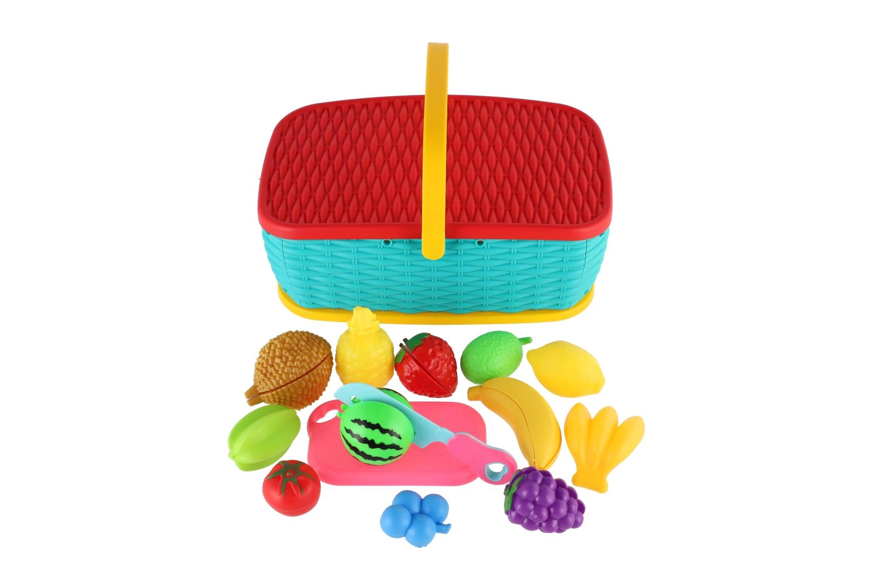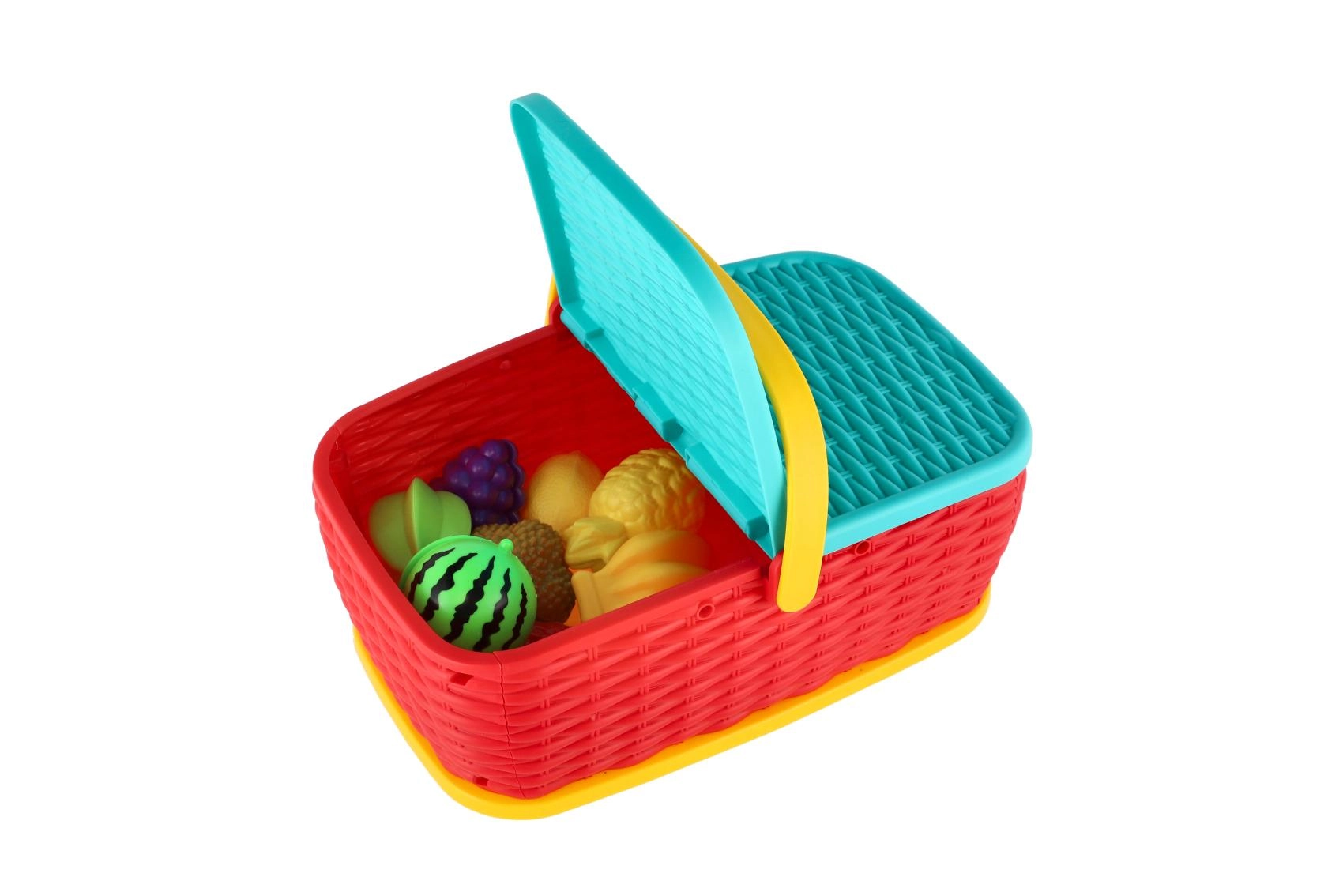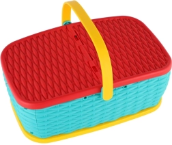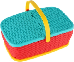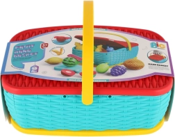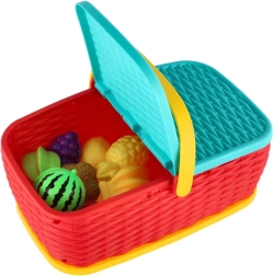 Hurá na piknik! Tento barevný plastový košík ukrývá sadu 15 dílů s ovocem a zeleninou, které si děti mohou „krájet“ bezpečným plastovým nožem. Díly jsou spojeny suchým zipem, takže je lze opakovaně rozpojovat a spojovat. Skvělá hračka pro rozvoj jemné motoriky, fantazie a her na kuchaře.