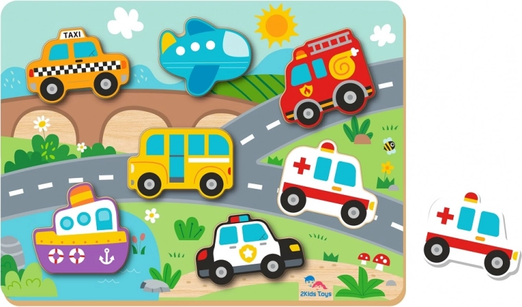 Toto vkládací puzzle je skvělým nástrojem pro rozvoj jemné motoriky a poznávání dopravních prostředků u dětí. Obsahuje 7 vkládacích dílků a pestrobarevné ilustrace, což činí z této hračky nejen zábavný prvek, ale také krásnou dekoraci do dětského pokoje.