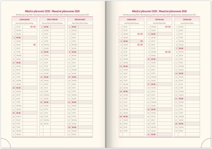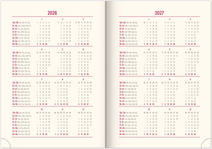 Elegantní týdenní diář pro rok 2026 s unikátním designem a rozšířeným jazykovým kalendáriem je ideální volbou pro každodenní plánování.
