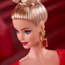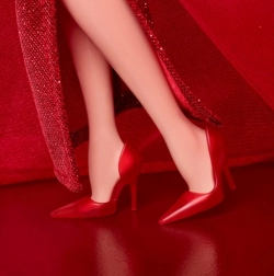 - Rubínově červené boty na podpatku doplňují její úchvatný vzhled a zlaté náušnice s motivem „M“ odkazují na tradiční logo Mattel.