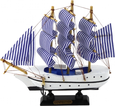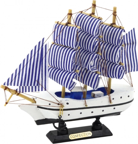 Textilní plachty s modro-bílými pruhy a pečlivé lany dekorativně doplňují jeho vzhled a připomínají čerstvý mořský vánek. Stabilní základna s tabulkou umožňuje jednoduché umístění na jakýkoli povrch.
