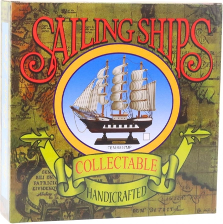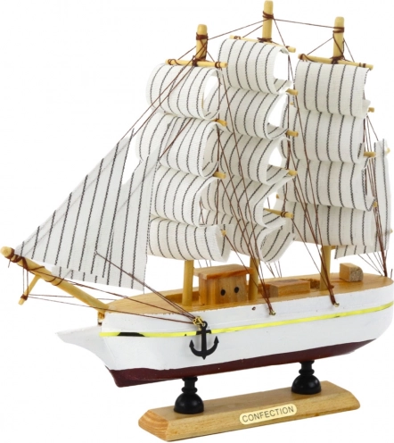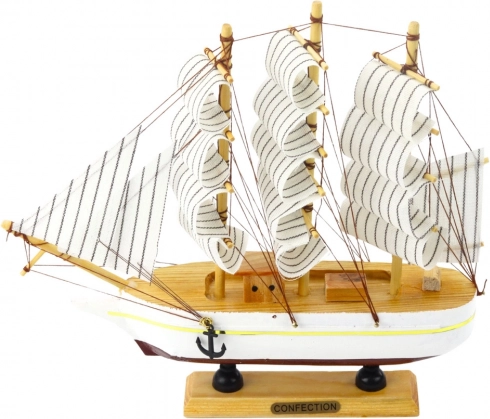 Tato replika je vyrobena z dřeva a ručně dokončena, což zajišťuje její autentičnost a kvalitu. Kombinace světlého trupu a černých pruhů na bílých plachtách tvoří vizuálně působivý kontrast.