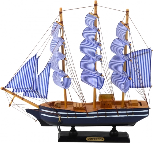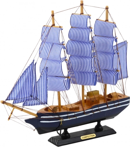 Tento dekorativní model třístěžňové plachetnice s modro-bílými pruhovanými plachtami je vyroben z vysoce kvalitního dřeva s textilními plachtami a detailním lanovím. Elegantní modro-bílé tělo s černým podstavcem tvoří estetický celek, který se hodí do stylového interiéru. Navzdory svým klasickým prvkům, dodává místnostem moderní a lehký vzhled.