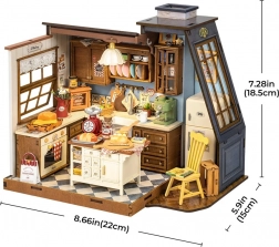 Skvělé doplňky, jako je kávovar, bílé pracovní desky a retro židle, zaručeně probudí ve vás chuť na domácí dobroty. Velká okna propouštějí vůni čerstvého pečiva, zatímco detaily jsou pečlivě promyšlené, aby vás přenesly zpět do kuchyně vašeho dětství.