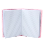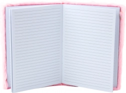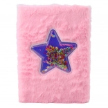 Obal je vyroben z měkkého, příjemného materiálu v intenzivní růžové barvě. Ve středu se nachází průhledná aplikace ve tvaru hvězdy, uvnitř které jsou barevné konfety, které se volně pohybují při každém pohybu zápisníkem. Tento detail odlišuje produkt od klasických zápisníků.