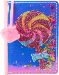 Notýsek s holografickým obalem a brokatovým lízátkem obklopeným pohyblivým konfetem ve tvaru a barvě je výrazný a veselý. Přední obal upoutá pozornost díky své holografické ploše, zatímco zadní část je příjemná na dotek díky plyšovému materiálu.