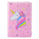 Obálka notýsku je pokryta pohyblivými, třpytivými flitry, které mění barvu z růžové na bílou pouhým přejetím ruky. Pod touto fascinující vrstvou najdete kouzelný motiv jednorožce s květinovou ozdobou, který uchvátí každého milovníka magických bytostí.