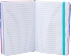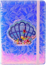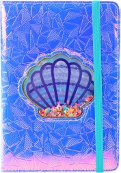 Střed obálky zdobí transparentní mušle plná konfeti ve tvaru květin a srdíček, které se volně přesouvají při každém pohybu. Celé je to zakončeno elastickou gumičkou kontrastní barvy, která udržuje blok zavřený a chrání stránky před ohnutím či nechtěným otevřením.