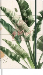 Vychutnejte si eleganci notatníku s tvrdou matnou obálkou, zdobenou realistickým motivem velkých zelených listů na světlém pozadí. Centrálně umístěný nápis „Let life grow“ dodává pozitivní náboj a jemnou energii.