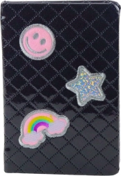 Notýsek ve formátu B6 s černým obalem pokrytým ochrannou fólií zajišťuje dlouhodobou odolnost a styl. Brokátová povrchová úprava spolu s nášivkami v podobě hvězdy, úsměvu a duhy dodávají moderní vzhled.