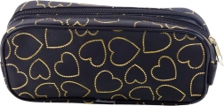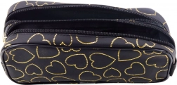 Vyroben z odolného textilního materiálu s jemným leskem, penál vyniká potiskem zlatých srdíček na intenzivně černém podkladu. Pevné zipy zajišťují bezpečné uchování obsahu. Jeho měkká, pružná konstrukce umožňuje snadné uložení do batohu nebo tašky bez zbytečného zabírání místa.