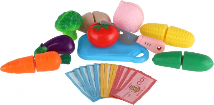 Barevná sada krájecí zeleniny s prkénkem, ideální pro malé děti od 3 let pro rozvoj motorických dovedností.