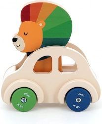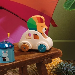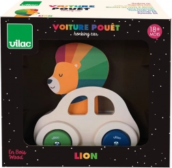 Toto rozkošné dřevěné autíčko je ideální hračkou pro malé děti. V jeho středu sedí malý lvček s barevnou hřívou a na jeho hlavičce je umístěn klakson, který se rozezní při zatlačení. To podněcuje interakci a zároveň vzbuzuje zájem o objevování.