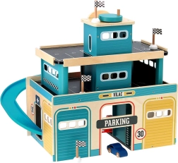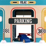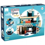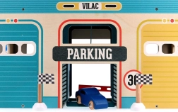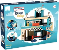 Dřevěná garáž ve vintage stylu z řady Vilacity nabízí dětem nekonečné možnosti hry. Díky posuvným dveřím, výtahu pro autíčka a spirálové dráze mohou děti: