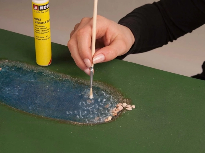 Modelová voda Noch je navržena pro snadnou tvorbu vodních ploch, jako jsou jezera, rybníky a mělké potoky bez spádu. Tento jednosložkový materiál nevyžaduje žádné míchání – stačí ho nalít přímo z lahvičky do připraveného koryta nebo dna.