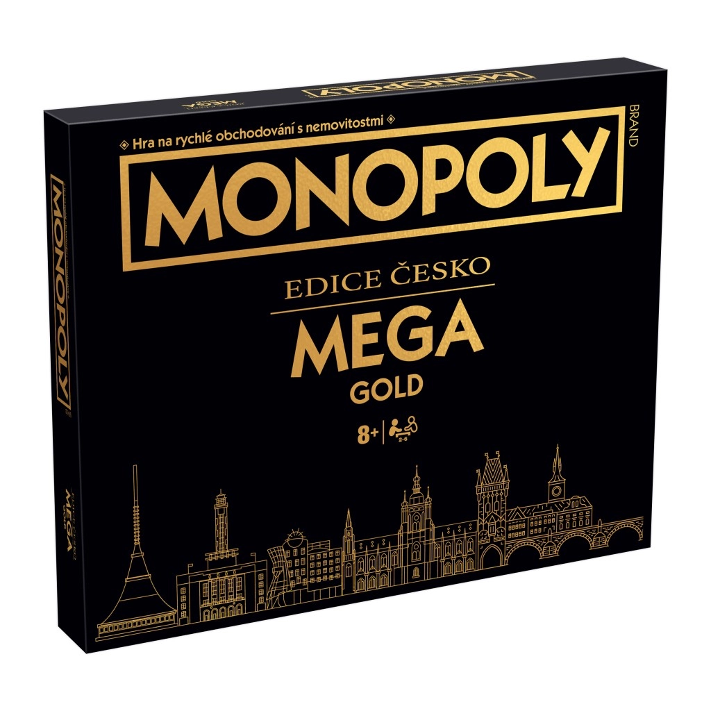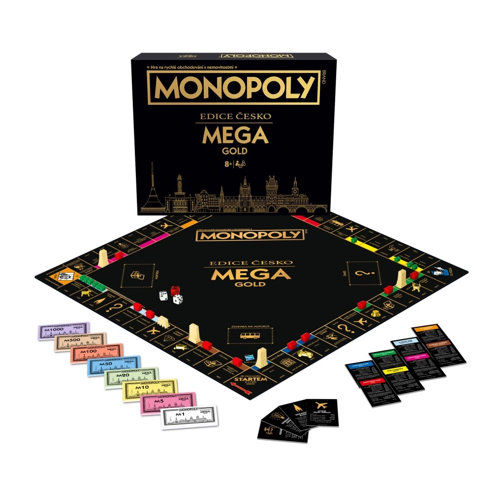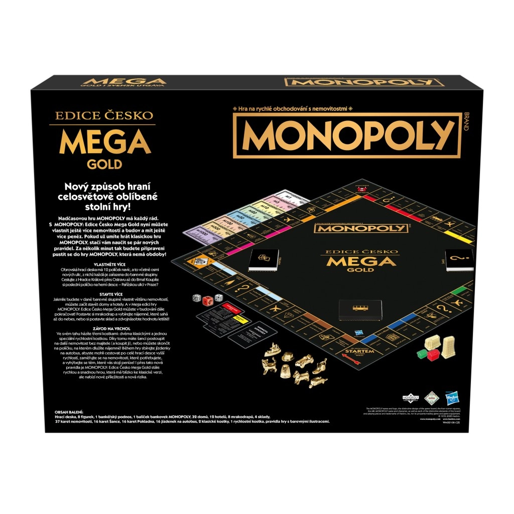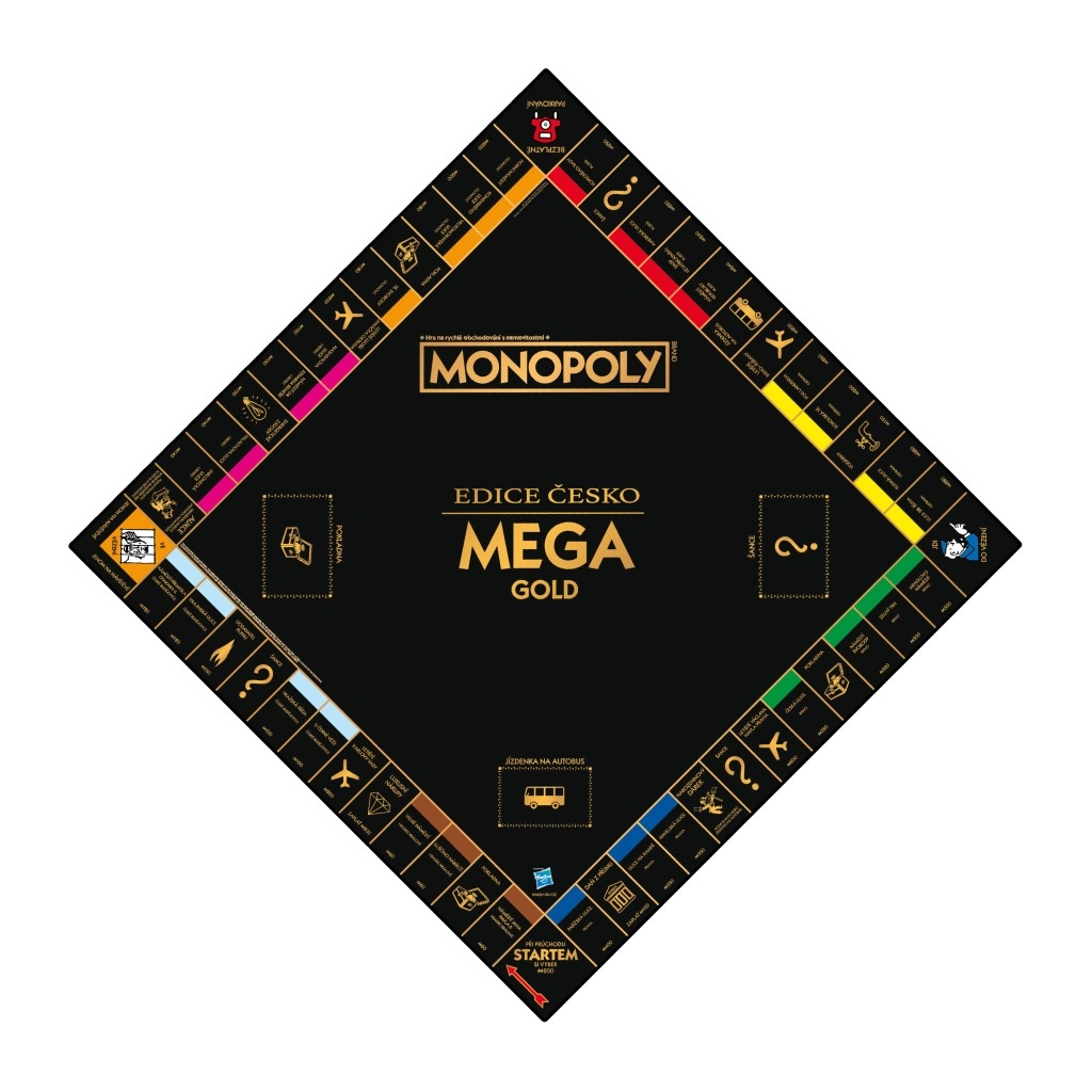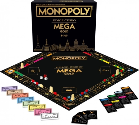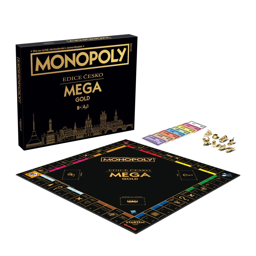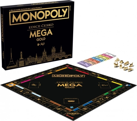 Monopoly Mega Gold Česká republika: luxusní sběratelská edice se zlatými figurkami, rozšířeným plánem a českými pravidly. Více nemovitostí, více zábavy.