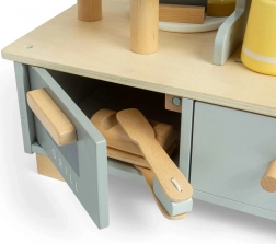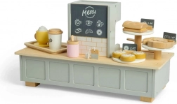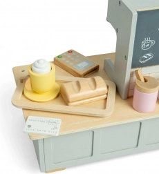 Děti mohou použít dřevěnou bankovní kartu a terminál na platby jako v opravdové kavárně. Tato sada poskytuje hodiny zábavy a umožňuje rozvoj jazykových a sociálních dovedností.