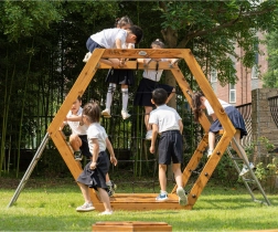 Robustní dřevěné hexagonální hřiště pro venek od Classic World Edu nabízí pestrou výzvu pro lezce všech úrovní. Kombinuje odolnou dřevěnou konstrukci s kovovými žebřinami, opičími bradly a lanovou lezeckou sítí pro rozvoj koordinačních dovedností, síly a rovnováhy. Ideální do zahrady, školky i rekreačních zón.
