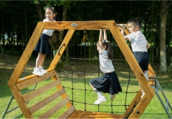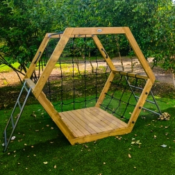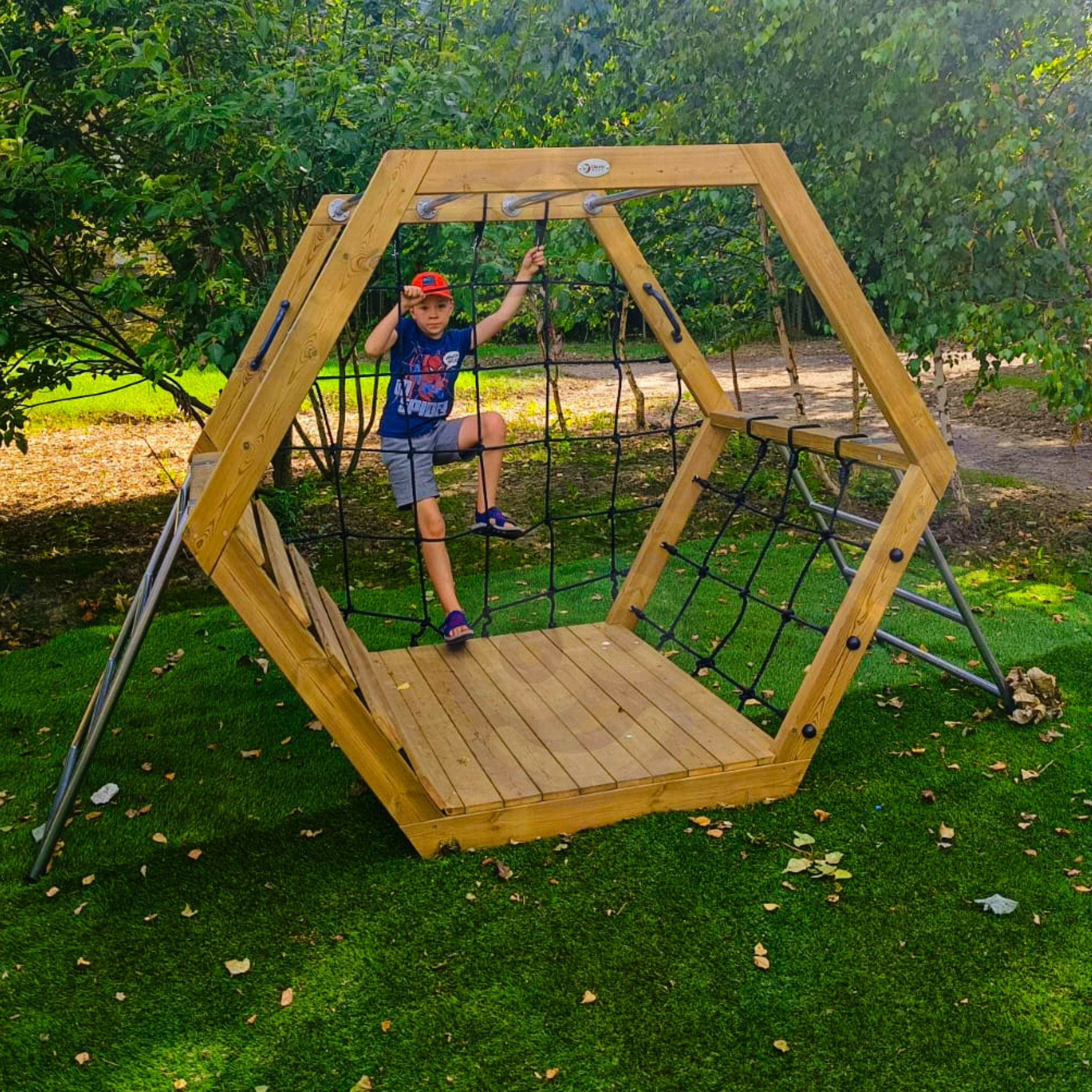 Toto velké venkovní lezecké hřiště s hexagonálním půdorysem poskytuje stabilitu, bezpečí a mnoho způsobů, jak se pohybově vyřádit. Děti mohou lézt po lanové síti, přecházet po kovových žebřinách a zavěšovat se na opičí bradla, čímž posilují celé tělo a zlepšují motoriku.
