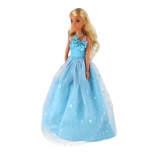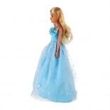Dlouhá světle modrá róba s jemným třpytem a květinovým zdobením promění panenku v královnu každé imaginární slavnosti.