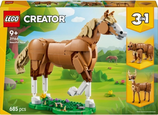 Objevte neomezené možnosti stavění se setem Creator 3 v 1: krásný kůň. Z jedné sady kostiček postavíte pohyblivou figurku koně se stojánkem, kterou lze nastavit do tří různých pozic: na třech či čtyřech nohách, nebo majestátně na zadních. Všechny modely vynikají detailním zpracováním a skvěle se hodí jak na hraní, tak na vystavení v dětském pokoji.