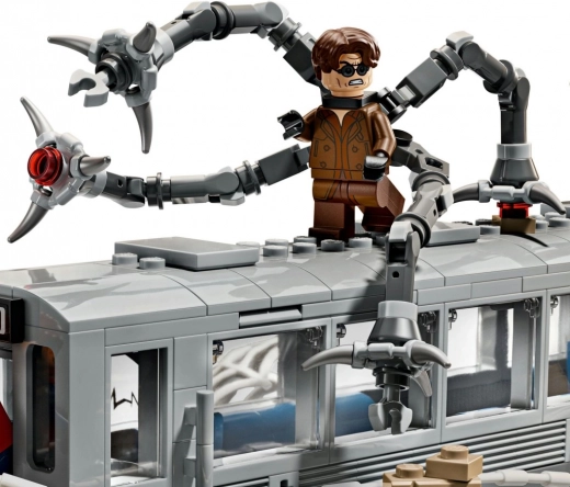 Přehrávejte si slavnou scénu: Spider‑Man zastavuje uhánějící soupravu pavučinou, zatímco Doc Ock útočí mechanickými chapadly. Akce a napětí na každém studu.