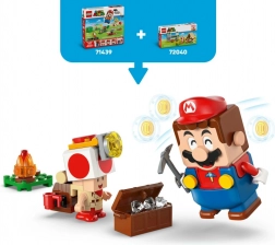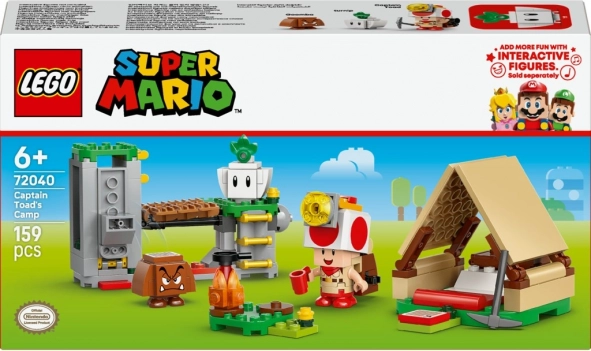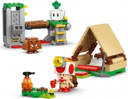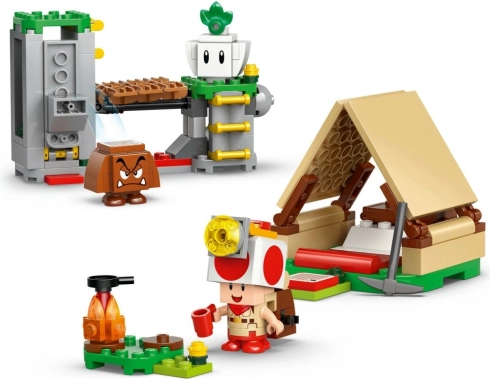 Vytvořte si dobrodružnou scénu s táborem kapitána Toada: postavte stan s bednou na poklady, rozdělejte ohníček, prozkoumejte skalní plošinu a aktivujte padací most, který pošle protivníka do „lávy“. Hledejte a schovejte diamanty, porazte Goombu a odpočívejte u ohně – zkrátka dokonalá porce kreativního hraní.