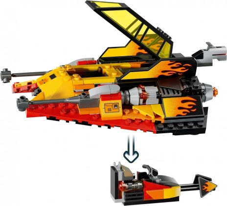 Otevírací dvojitý kokpit ukrývá odpojitelný speeder – stiskem sedadla nebo hlavy minifigurky speeder okamžitě vypustíte do akce.