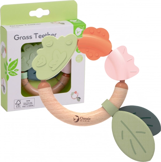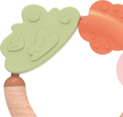 Jedinečná kombinace přirozeného dřeva a měkkého silikonu stimulují smysly a povzbuzují k objevování světa, čímž se stává dokonalým prvním kousátkem a chrastítkem pro každé dítě.