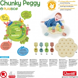 Chunky Peggy je barevná stavebnice navržena pro rozvoj dětské motoriky a koordinace ruky a oka. Díky použití biokompozitního materiálu z dřeva a plastu, notně přátelského k životnímu prostředí, je tato hračka zároveň udržitelná i zábavná. Ve chvíli, kdy se ponoří do světa barev a tvarů: