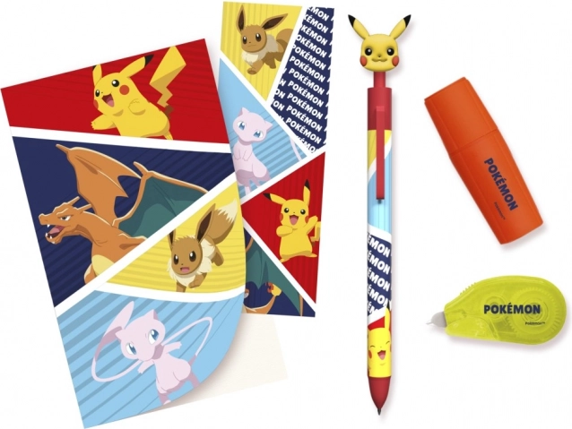 Oficiálně licencovaná Pokémon školní sada: pero, korektor, zvýrazňovač, sešit a záložka pro fanoušky.