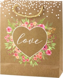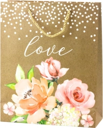 Tato dárková taška se pyšní jemným spojením krásných, barevných květů a nápisu "Love". Drobné brokátové kropky na vrcholu tašky dodávají jemnost a lehkost.