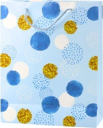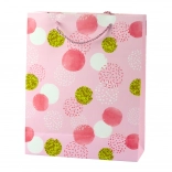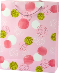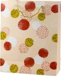 Tečky různých velikostí, některé s třpytivým efektem nebo dekorativním potiskem, dodávají celku originální a efektní charakter. Taška je vyrobena z odolného laminovaného papíru, který je odolný vůči ohybům, což umožňuje bezpečné zabalení i těžších dárků.