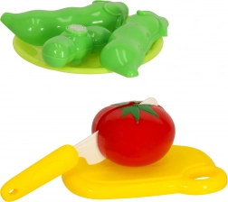 Tato bohatá sada umožní dětem připravovat "jídla" z barevného ovoce a zeleniny rozdělené na díly, které se spojují suchým zipem. Hraní s nožíky a příslušenstvím napomáhá správnému úchopu, koordinaci oko–ruka a přirozeně seznamuje s názvy potravin.