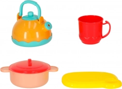 - Kuchyňské doplňky (15 ks): konvička, hrnec s poklicí, příbory (velký a malý nůž, lžička, vidlička), hrnek, krájecí prkénko, dětská plotýnka/kuchyňka, košík.