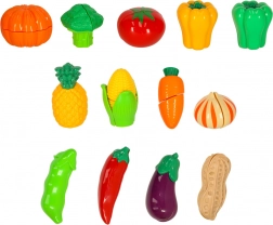 - Ovoce a zelenina na suchý zip (13 ks): hrášek v lusku, zelená paprika, žlutá paprika, chilli paprička, cibule, brokolice, kukuřice, rajče, ananas, dýně, lilek, fazole, mrkev.
