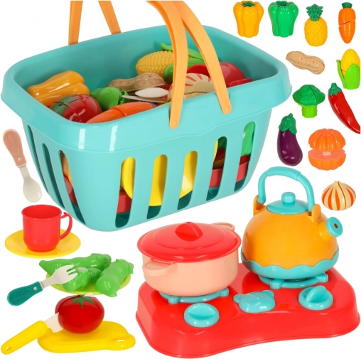 Díky velkému počtu prvků si děti zahrají obchod, kuchyňku i restauraci. Krájení, servírování i vaření s konvičkou, hrncem a krájecím prkénkem rozvíjí fantazii, komunikaci a podporuje zavádění zdravých stravovacích návyků.