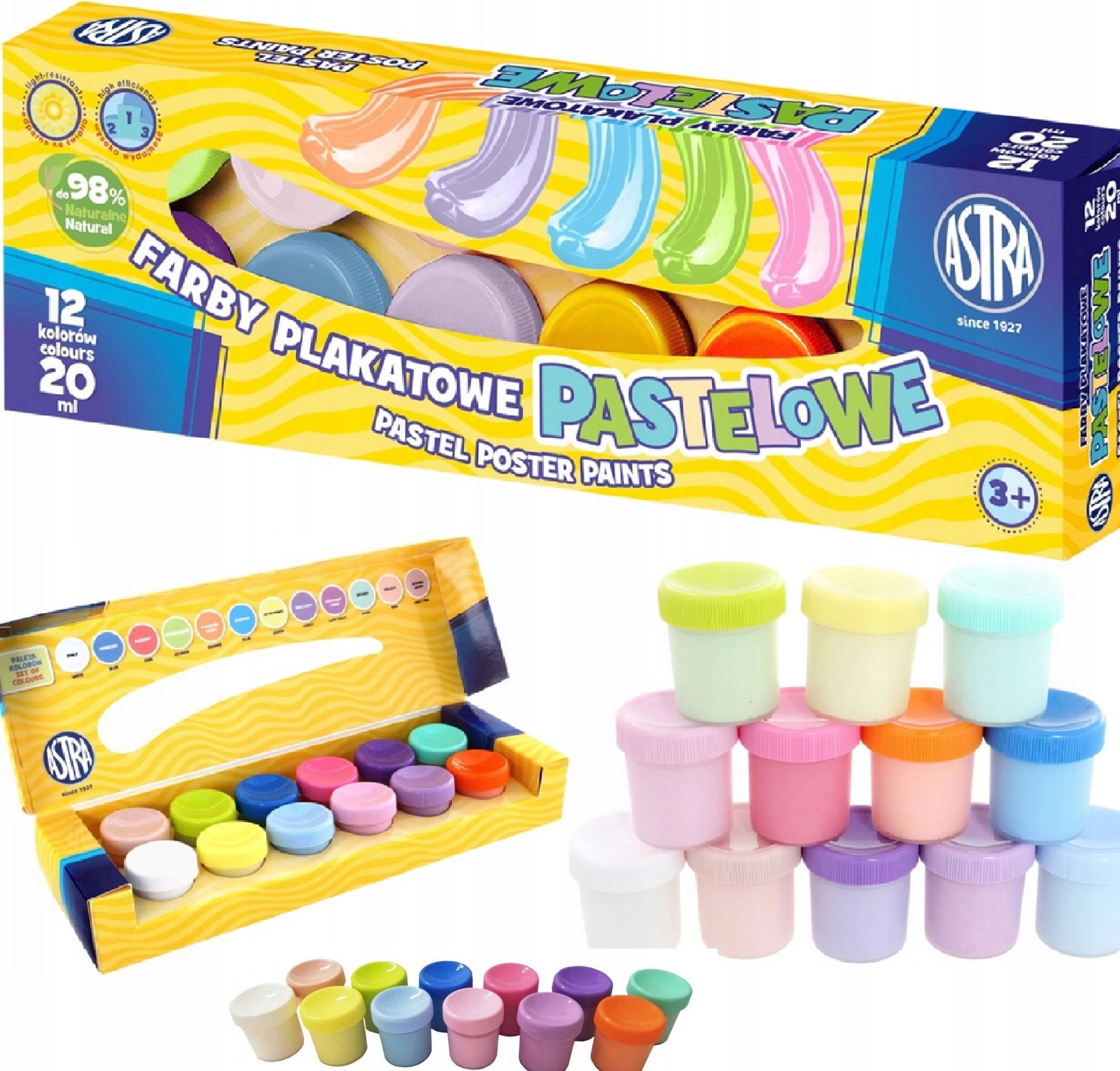 Pastelové temperové barvy ASTRA 12×20 ml potěší děti i začínající tvůrce jemnými, světle laděnými tóny. Jsou vodou ředitelné, mají vysokou krycí schopnost, po zaschnutí zanechávají matný povrch a jsou odolné vůči světlu – ideální pro školní i domácí tvoření.