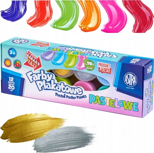 Sada pastelových temperových barev ASTRA přináší 12 jemných odstínů po 20 ml, včetně 2 metalických tónů. Barvy jsou vodou ředitelné, mají vysokou krycí schopnost, po zaschnutí matný povrch a odolnost vůči světlu – ideální pro školní i domácí tvoření.