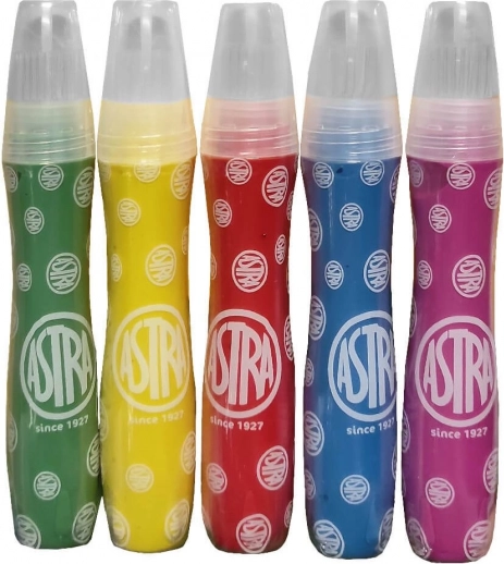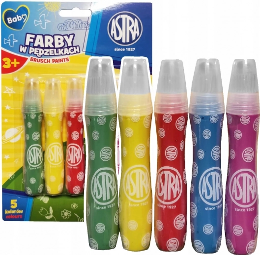 Ideální sada pro malé umělce: ASTRA barvy ve štětcích, 5 ks. Každý štětec už obsahuje barvu, takže nejsou potřeba další pomůcky. Snadné použití stiskem, bezpečné složení a design pro děti od 3 let – skvělé na papír a karton.