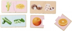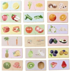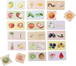 Dřevěné Montessori puzzle s motivem ovoce a zeleniny učí děti správně párovat shodné dílky a pojmenovávat jednotlivé druhy potravin. Realistické ilustrace pomáhají propojit hru s každodenním životem a podporují přirozené učení formou hry.