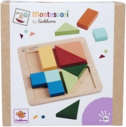 Objevte chytrou zábavu pro nejmenší: dřevěná skládačka Montessori s deskou ze 4 čtverců a 12 barevnými dílky. Úkolem je vyplnit plochu čtverce a přitom rozvíjet logiku, jemnou motoriku a vnímání barev. Vyrobeno ze 100% FSC břízy a lípy, vhodné od 2 let.