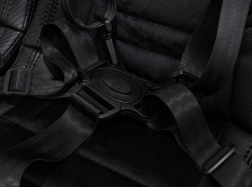 Ergonomické dvoumístné sedačky z eko kůže s velurovým došitím poskytují komfort a jistotu. Nastavení ve 3 krocích a vícebodové pásy udrží malé řidiče pevně na místě.