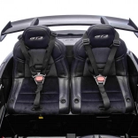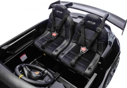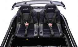 Multimediální panel s vyjímatelným MP4 tabletem potěší oblíbenými melodiemi, FM rádiem, přehráváním MP3 přes USB/AUX i Bluetooth. Sportovní režim zvýrazní zvukové efekty při sešlápnutí plynu. Dvojité sedadlo z ekokůže s velurovým finišem a bezpečnostními pásy má 3stupňové nastavení pro ideální posed.